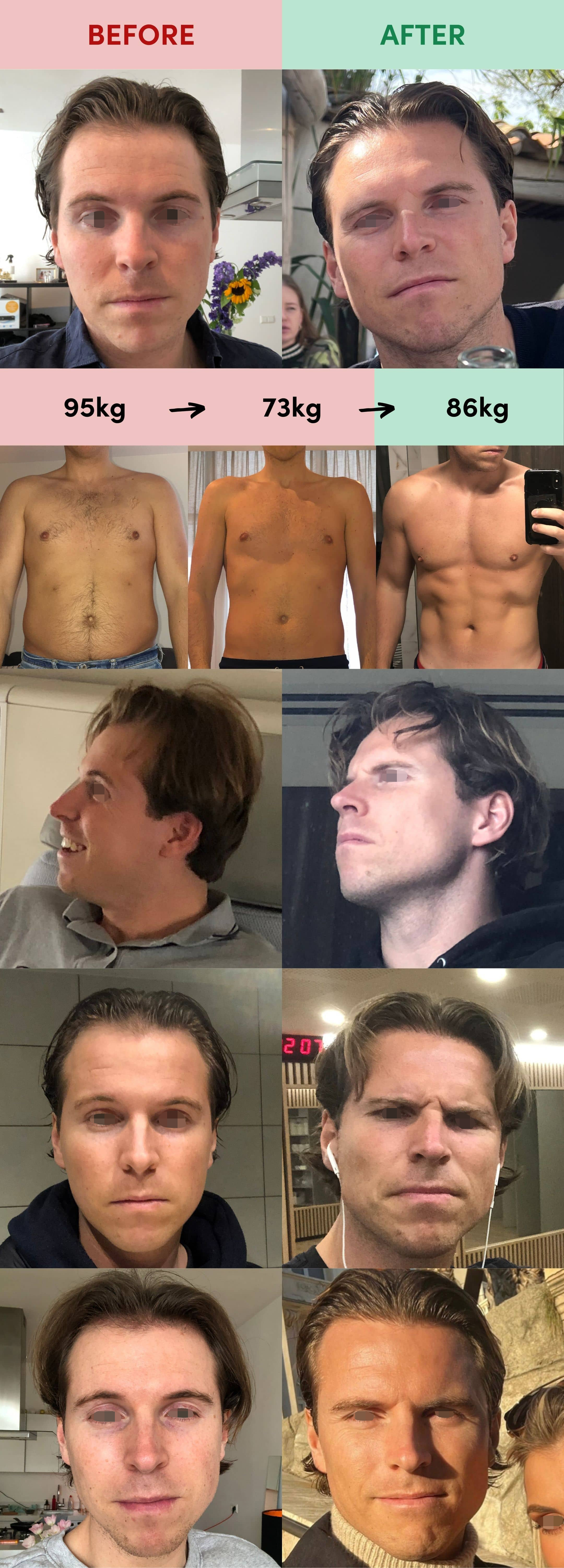 (I'm a very private guy and I don't want my face to be on the internet, hence the blurring, the results aren't less because of it. It's especially important to look at the shape of the face & the now sharp masculine angles)